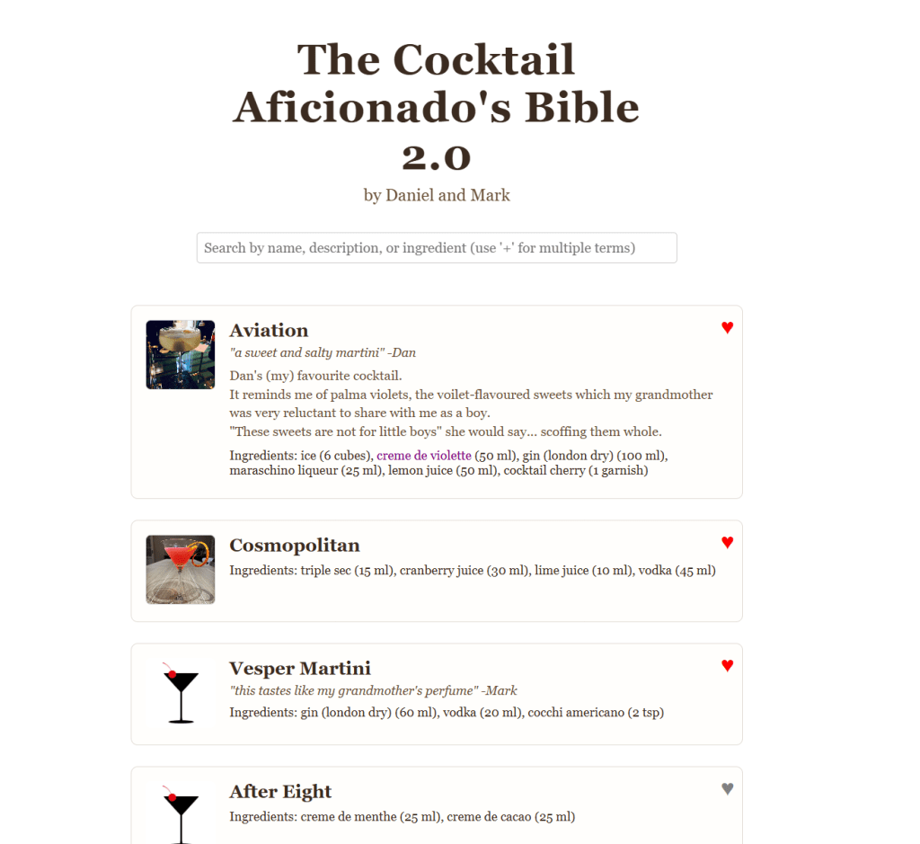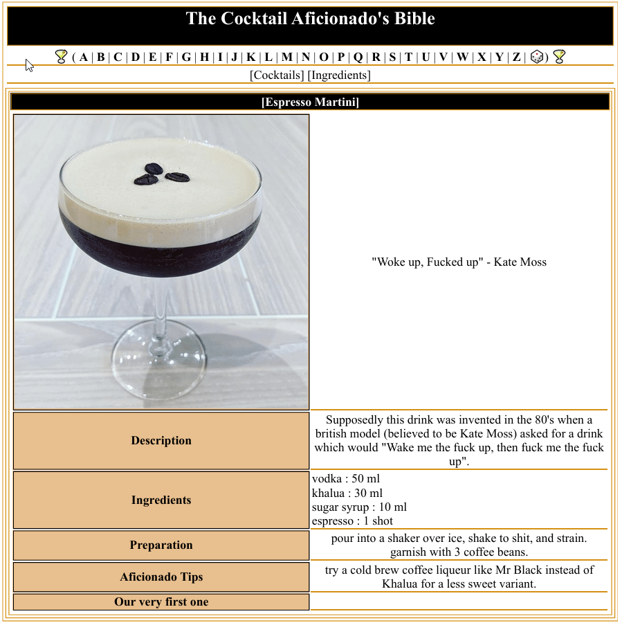 Though, we quickly realised that tracking our mixology journey wasn’t a job for pen and paper… and I resolved to make a PHP/MySQL site that looked straight out of 1996: