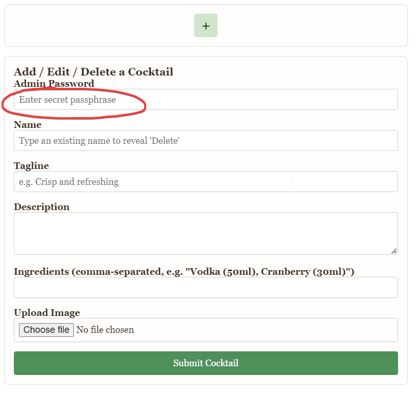 Adding, editing, or deleting a cocktail is an operation limited to either my friend or I. So here’s the form I added to the UI for those updates: